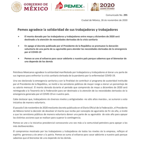 Pemex agradece la solidaridad de sus trabajadoras y trabajadores