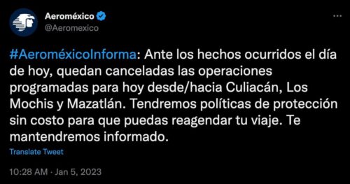 Cancelan vuelos a Culiacan, Mochis y Mazatlán, informó el Aeropuerto Internacional de Culiacán y Aeroméxico.