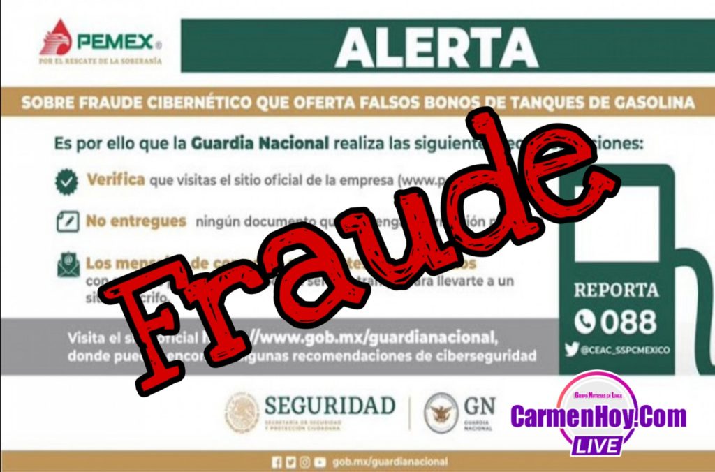 La Guardia Nacional informa que la Dirección General Científica, a través del monitoreo de la Red Pública de Internet, detectó que el portal https://bono-combustible.club/pemex/?s=1# suplanta la identidad de la empresa Petróleos Mexicanos, y puede potencialmente ser usado en un esquema de fraude mediante la promoción de bonos de tanques de gasolina.