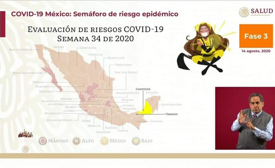 Campeche aparece en amarillo en el semáforo de riesgo de Covid-19 de autoridades federales, indica que la velocidad de contagios está en descenso.