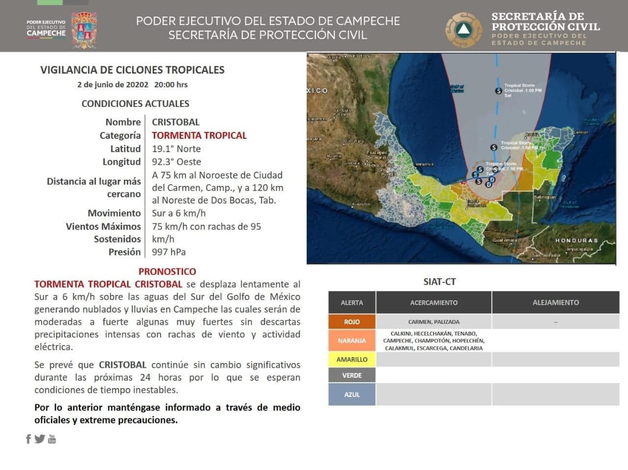 Debido a la distancia y desplazamiento actual de la Tormenta Tropical Cristobal, se ha emitido la alerta ROJA para nuestro municipio.