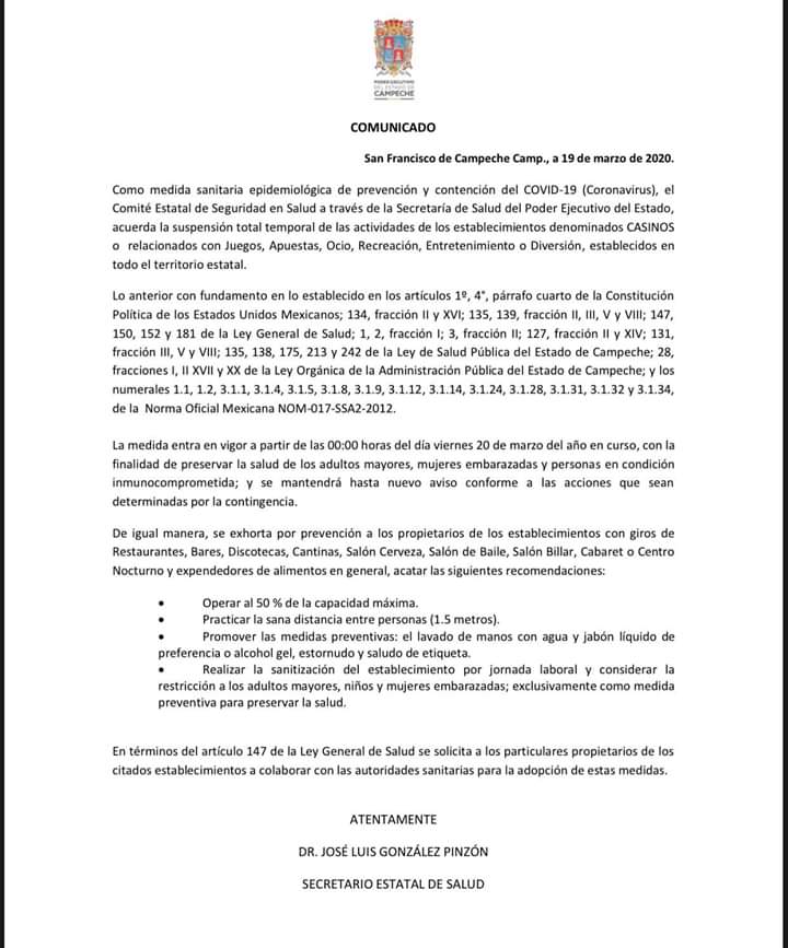 Como medida sanitaria epidemiológica de prevención y contención del COVID-19 (Coronavirus), el Comité Estatal de Seguridad en Salud a través de la Secretaría de Salud del Poder Ejecutivo del Estado, acuerda la suspensión total temporal de las actividades de los establecimientos denominados CASINOS o relacionados con Juegos, Apuestas, Ocio, Recreación, Entretenimiento o Diversión, establecidos en todo el territorio estatal.