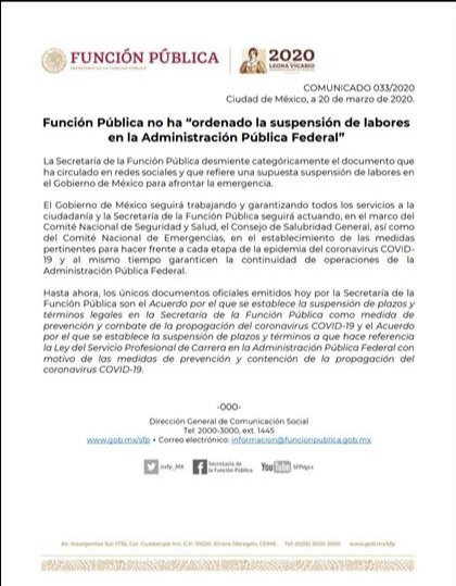 La Secretaría de la Función Pública desmiente categóricamente el documento que ha circulado en redes sociales y que refiere una supuesta suspensión de labores en el Gobierno de México para afrontar la emergencia.