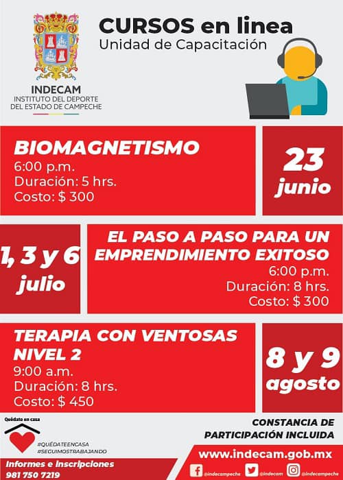 El Instituto del Deporte de Campeche (INDECAM) a través de la Unidad de Capacitación extiende la invitación para formar parte de los Cursos en Línea que iniciarán el 23 de junio y culminarán el 9 de agosto, e incluiránconstancia de participación avalada por la dependencia estatal.