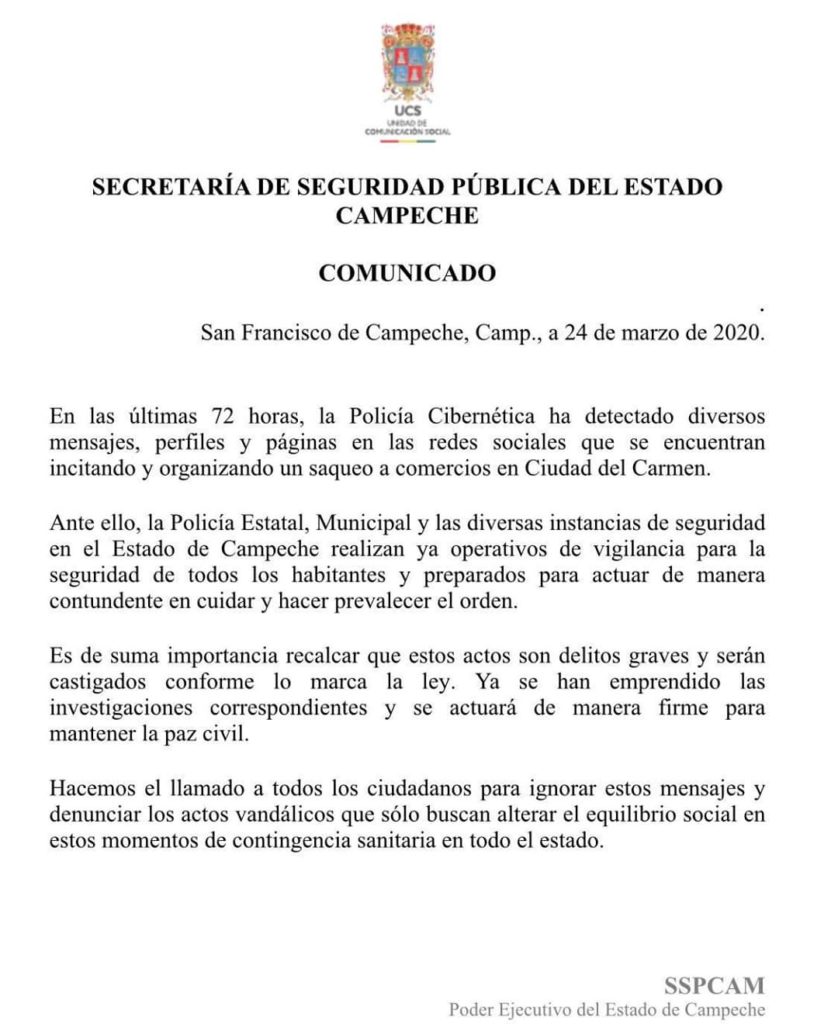 En las últimas 72 horas, la Policía Cibernética ha detectado diversos mensajes, perfiles y páginas en las redes sociales que se encuentran incitando y organizando un saqueo a comercios en Ciudad del Carmen.