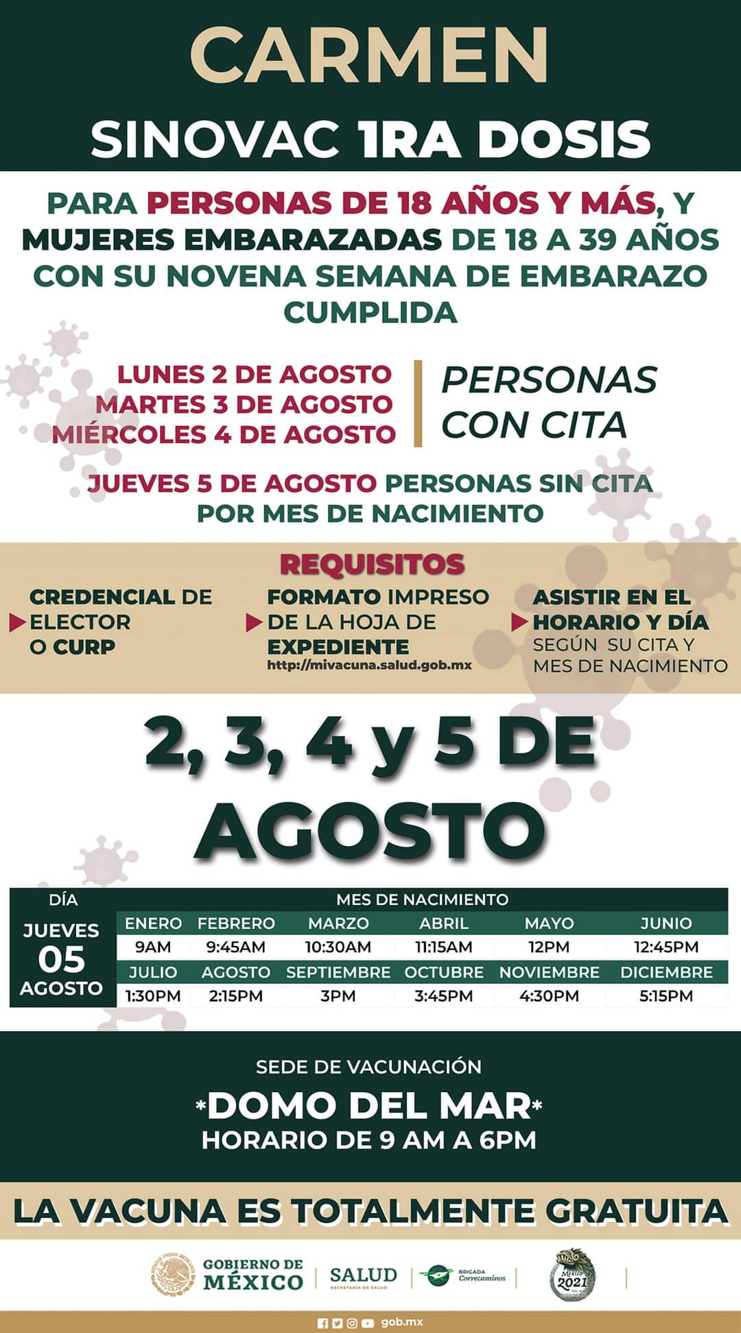 PRIMERA DOSIS marca SINOVAC en el municipio de Carmen, para personas de 18 años y más, así como mujeres embarazadas de 18 a 39 años con la novena semana de gestación cumplida, los días: