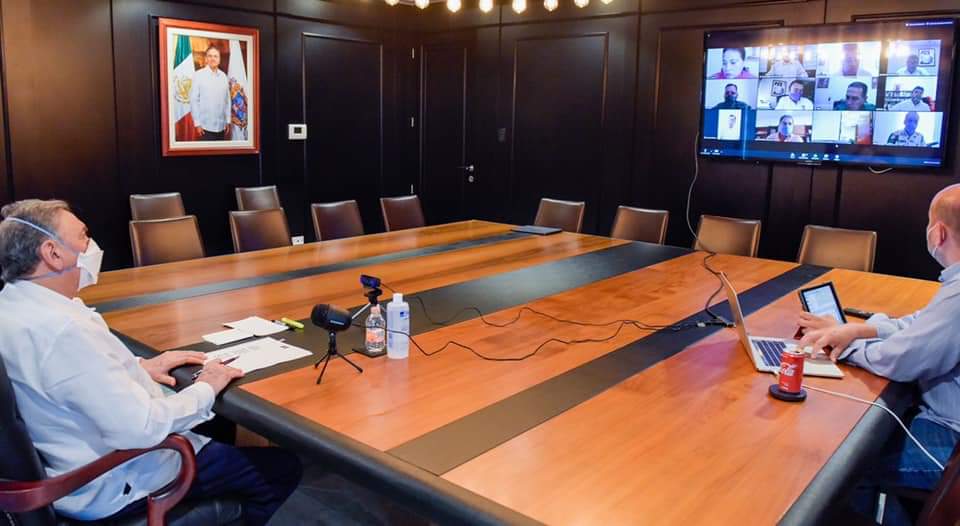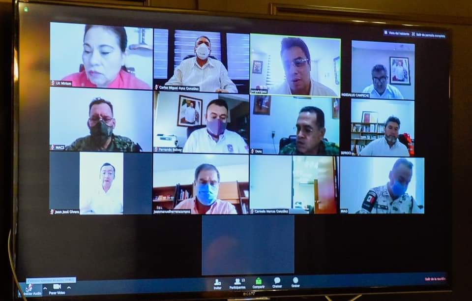 Durante la reunión vía remota, los secretarios de Salud, José Luis González Pinzón y de Protección Civil, Edgar Hernández Hernández, informaron del panorama epidemiológico local y de los avances en la evaluación de daños por la tormenta tropical Cristóbal, respectivamente.