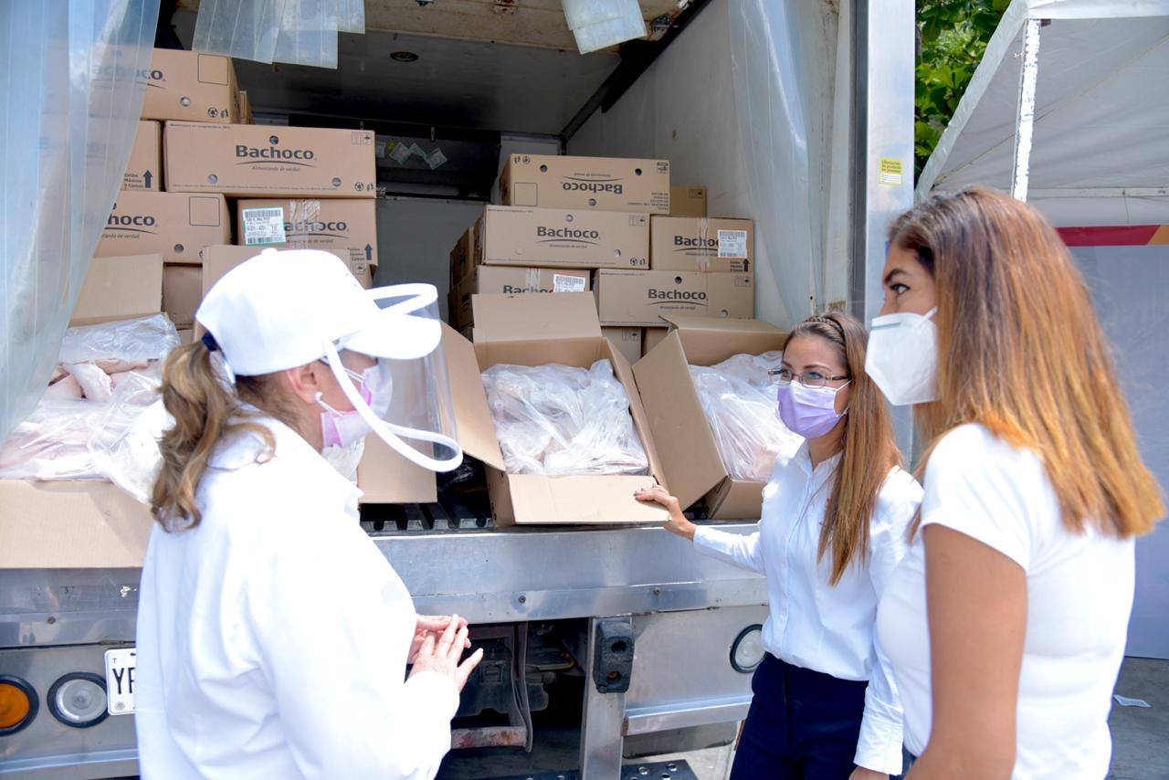 Posteriormente, Damas de Aysa entregó a la presidenta y a la directora del Sistema DIF municipal de Carmen, Viridiana Suárez de Rosas y Marbella Mayela Rangel Herrera, el donativo de pollo y leche para ser repartida a familias carmelitas que resultaron afectadas por la actual contingencia sanitaria.