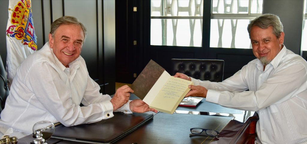 Previo a la presentación de su libro “Campeche, una historia compartida” , el embajador de México en Polonia, el campechano Alejandro Negrín Muñoz, obsequió un ejemplar autografiado al gobernador Carlos Miguel Aysa González.