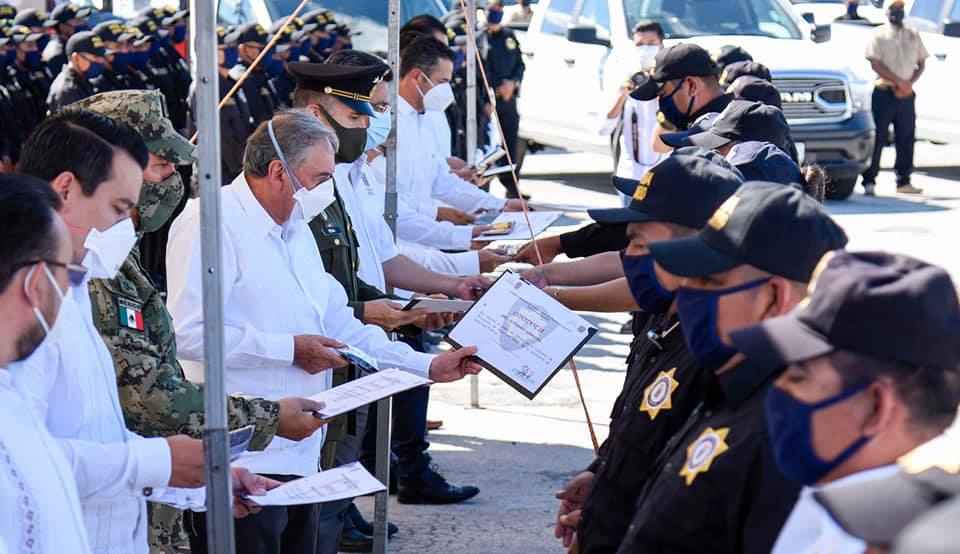 En el foro Ah-Kim-Pech, el mandatario también otorgó, como parte de las acciones de reforzamiento de la seguridad, constancias de graduación a 73 elementos de la XXII Generación de la Policía Estatal y 15 de la Segunda Generación de la Policía de Vialidad, además de insignias de ascenso a 68 guardianes del orden.