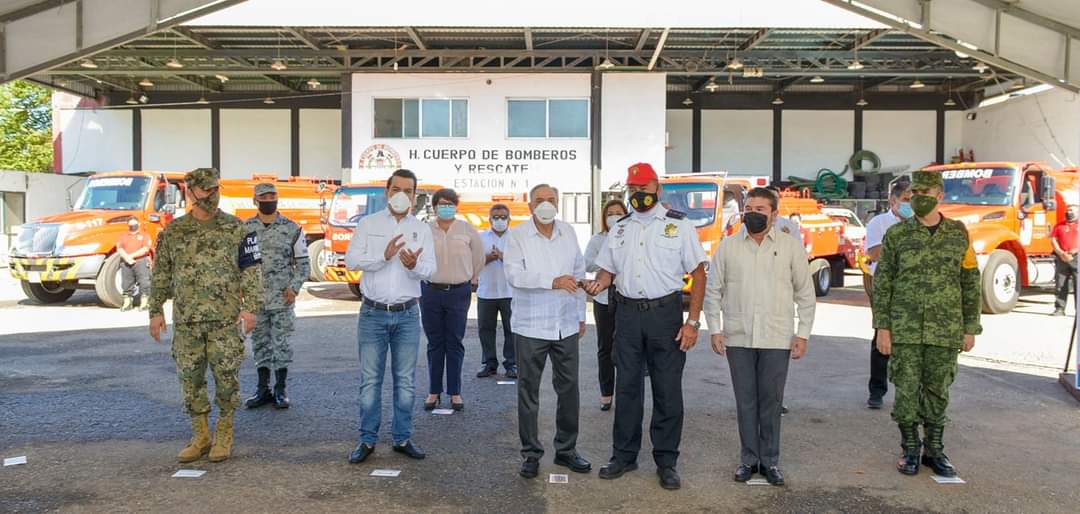 Esta mañana, el subdirector de Bomberos, Justo Ancona Inurreta, recibió del mandatario las llaves de dos pipas con capacidad para transportar tres mil 500 litros de agua y de otras dos con capacidad para 10 mil litros.