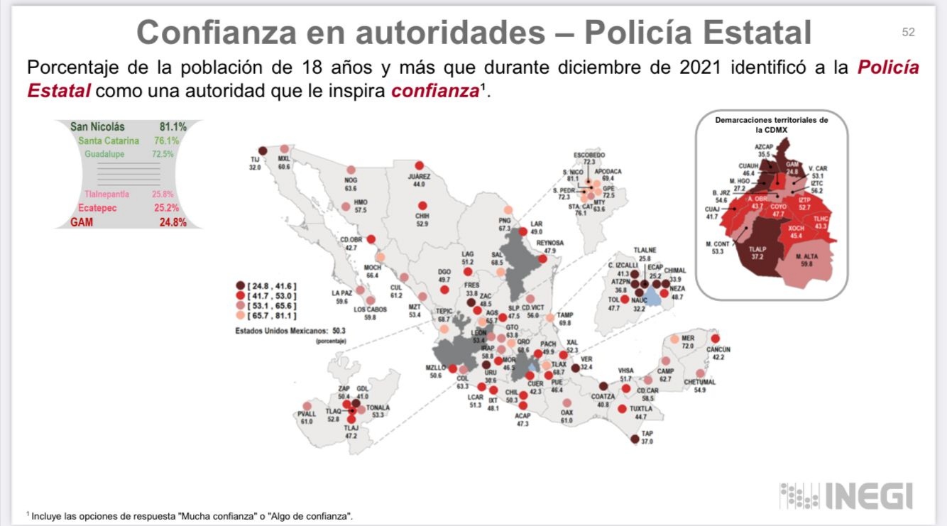 También escuchó el reporte de la Secretaría de Protección y Seguridad Ciudadana, basado en datos del INEGI, sobre el desempeño de la policía estatal, que alcanzó un 61.9 por ciento en Campeche capital y 56.1 en Ciudad del Carmen de aprobación en diciembre del 2021; en tanto que la confianza en la policía estatal, a diciembre del año pasado, aumentó 62.7 en Campeche capital y 58.5 en Ciudad del Carmen.