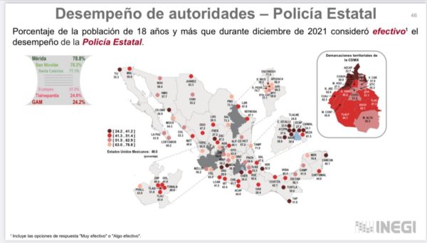 También escuchó el reporte de la Secretaría de Protección y Seguridad Ciudadana, basado en datos del INEGI, sobre el desempeño de la policía estatal, que alcanzó un 61.9 por ciento en Campeche capital y 56.1 en Ciudad del Carmen de aprobación en diciembre del 2021; en tanto que la confianza en la policía estatal, a diciembre del año pasado, aumentó 62.7 en Campeche capital y 58.5 en Ciudad del Carmen.