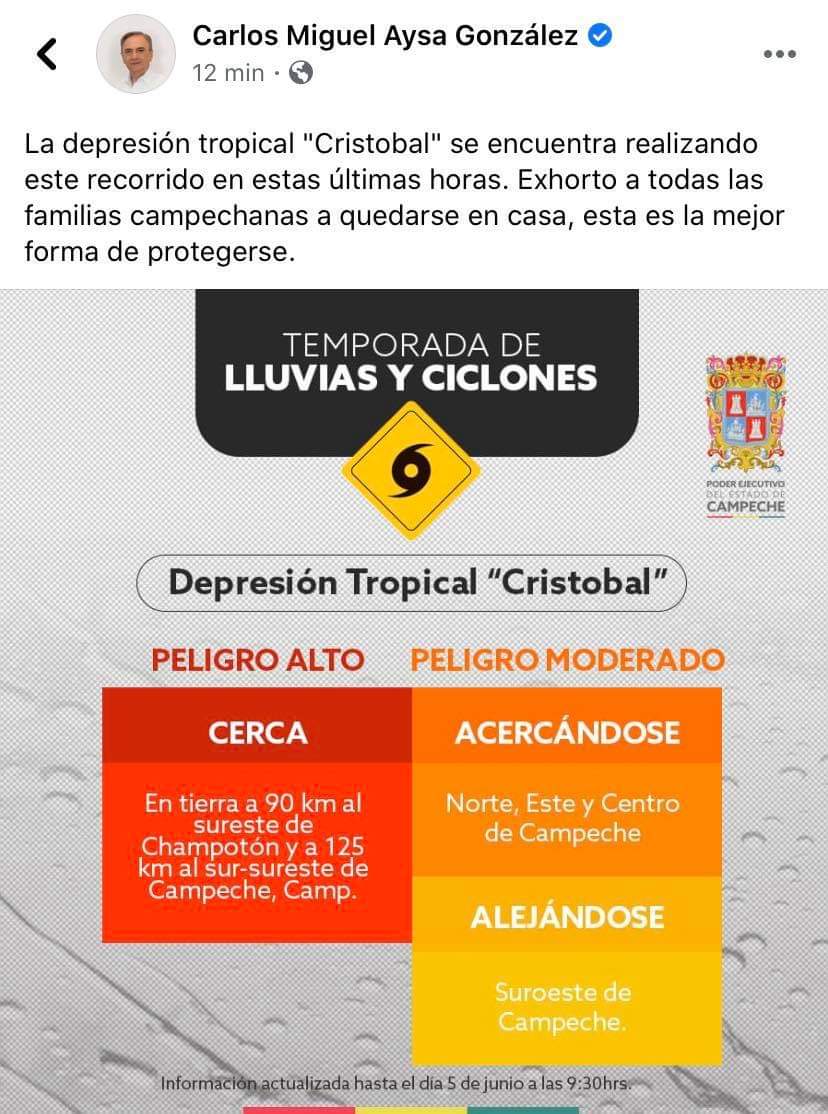 GOBERNADOR AYSA PIDE A CAMPECHANOS QUEDARSE EN CASA ANTE CERCANÍA DE “CRISTÓBAL”