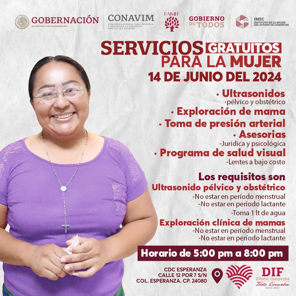 El Instituto de la Mujer del Estado de Campeche continúa brindando servicios gratuitos a mujeres en los horarios de 5 de la tarde a 8:00 de la noche en el CDC Esperanza.