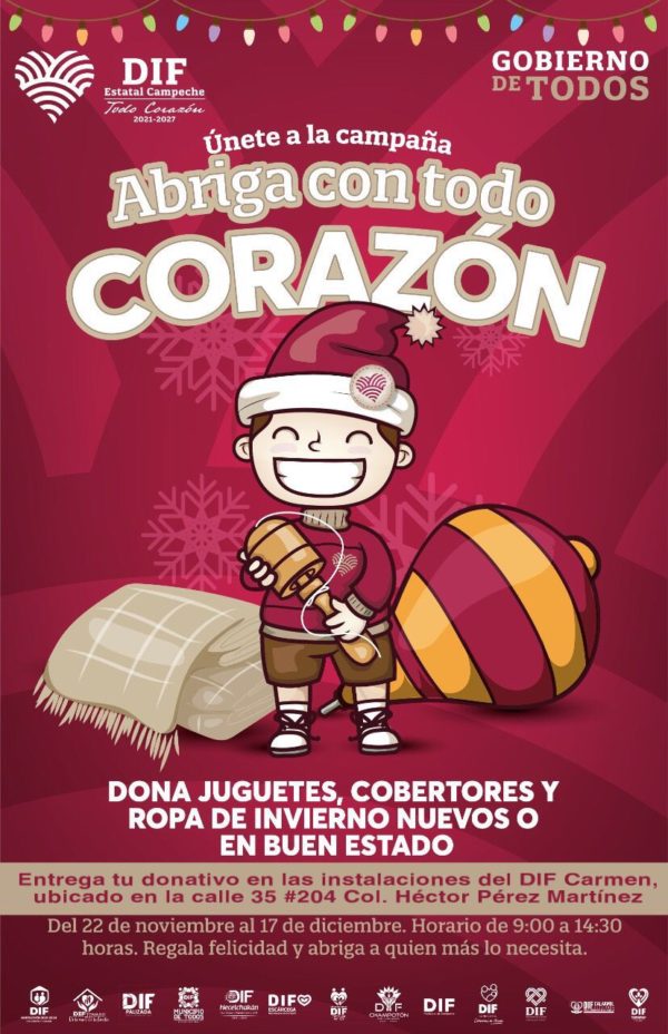 El Sistema para el Desarrollo Integral de la Familia del Municipio de Carmen en coordinación con el Sistema DIF Estatal, Gobierno del Estado, los 13 DIF Municipales, Asociaciones Civiles, e Iniciativa Privada, invita a la ciudadanía en general, a unirse a la campaña “Abriga con Todo Corazón”, que consiste en donar cobertores, ropa de invierno y juguetes nuevos o en buen estado, que podrán llevar a la sede de la institución, ubicada en la calle 35 No. 204 en la Col. Héctor Pérez Martínez, en días hábiles, en horario de 9:00 A.M. a 02:30 P.M., a partir del 22 de noviembre y hasta el 17 de diciembre del año en curso.