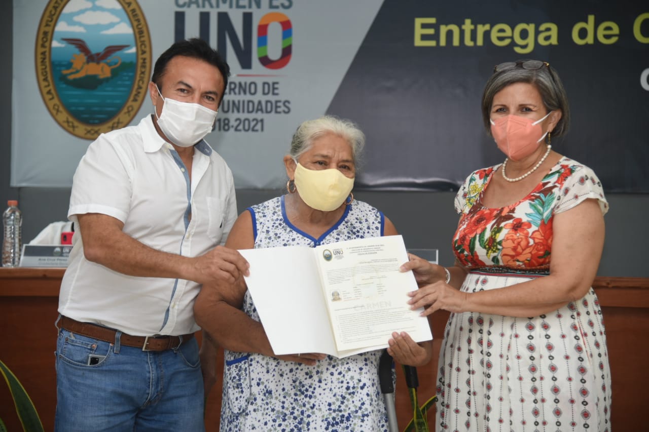 Estuvieron en el Presídium: el Presidente Municipal de Carmen, Óscar Rosas González; el Sexto Regidor del Ayuntamiento, Miguel Ángel Puch Rivera; la Directora de Desarrollo Urbano, Celina Santos Alayola y la beneficiaria Ana Cruz Pérez Aguirre.