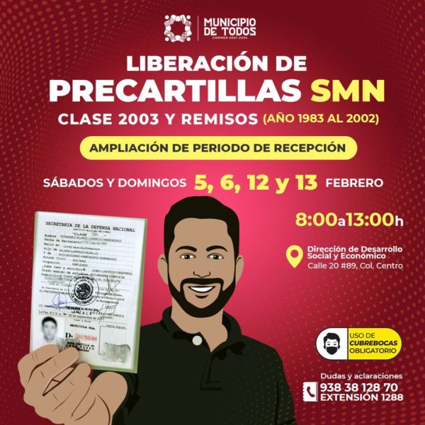El Gobierno Municipal de Carmen, a través de la Junta Municipal de Reclutamiento, convoca a los jóvenes de la clase 2003 y remisos (del año 1983 al 2002), a presentarse únicamente los sábados y domingos del mes de febrero, los días 5, 6, 12 y 13, a la ampliación de recepción de precartillas del Servicio Militar Nacional (SMN), para su trámite de liberación.