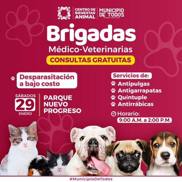La Brigada Médico-Veterinaria llega este sábado 29 de enero al Parque de Nuevo Progreso, de 9:00 A.M. a 2:00 P.M., para brindar atención a los animalitos domésticos y a callejeritos.