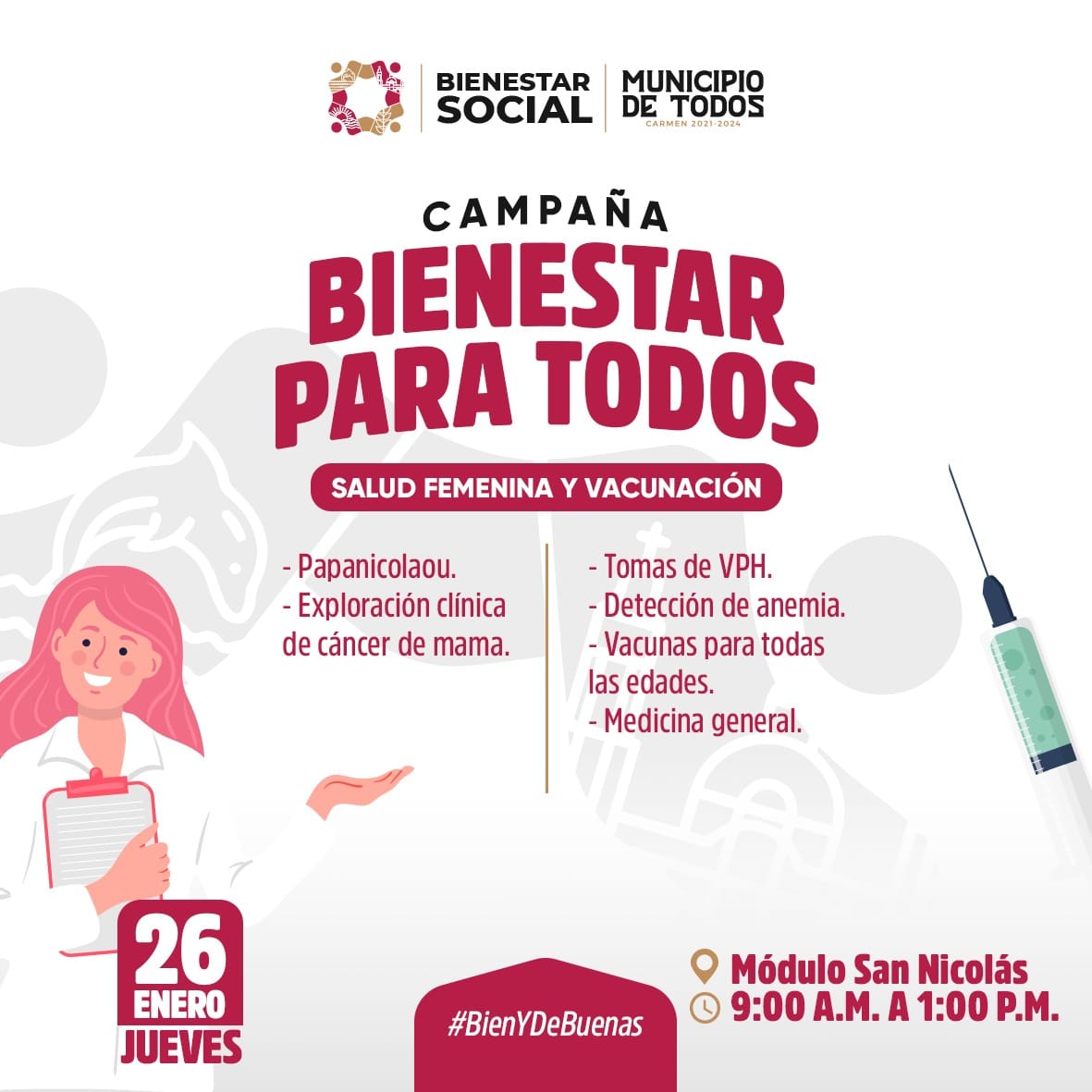 Ven a la Campaña bienestar para todos con servicios #GRATUITOS de salud femenina y vacunación: