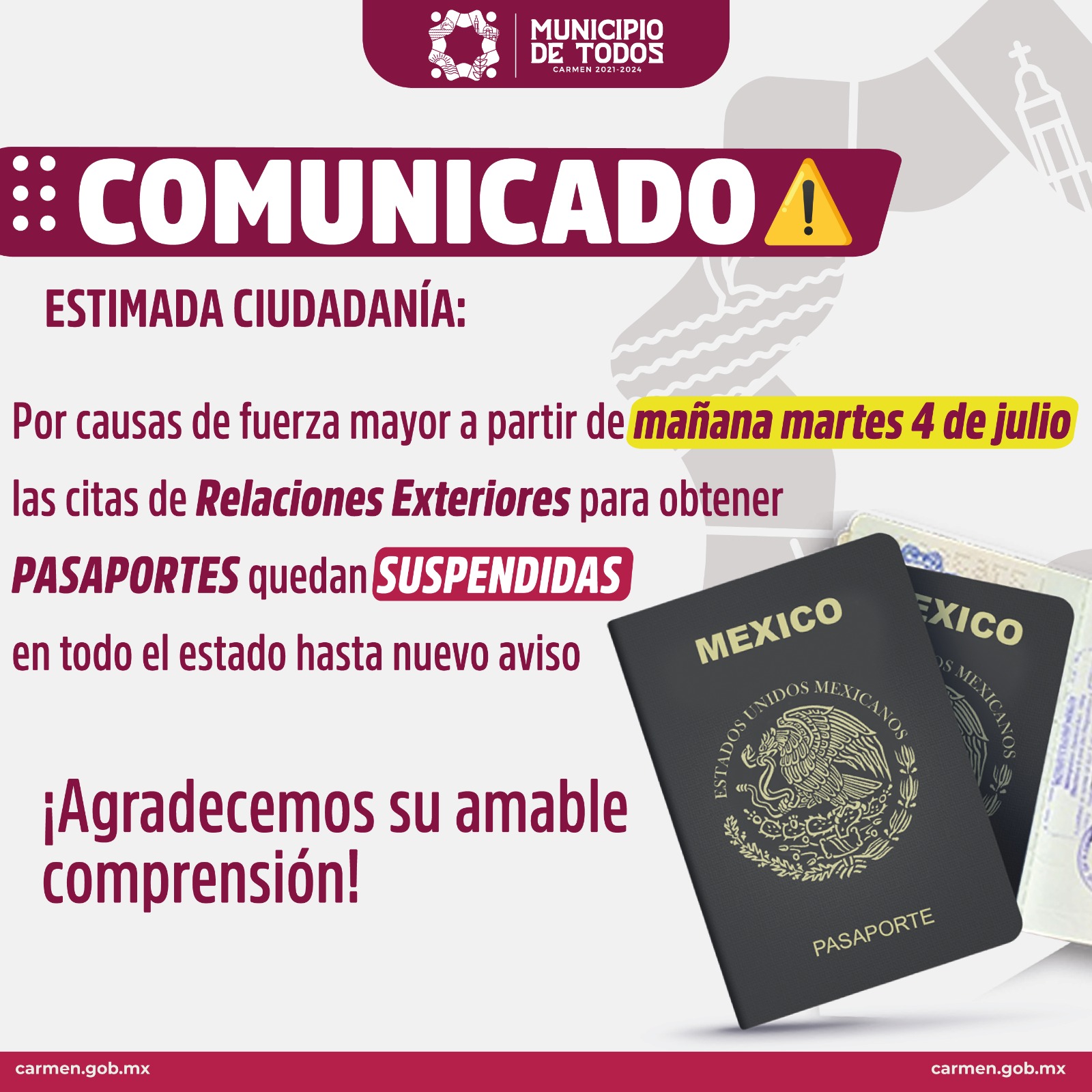 A partir de MAÑANA martes 4 de julio, quedan suspendidas las citas para trámite de PASAPORTES debido a causas de fuerza mayor, no habrá servicio hasta próximo aviso se recomienda acudir ante las oficinas de la Secretaría de Relaciones Exteriores en la ciudad de Villahermosa o Mérida.