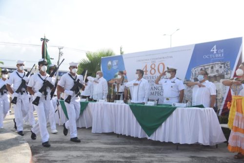 Durante el acto cívico que se realizó en el monumento a la Mujer Campechana, primeramente se procedió con los honores a la bandera donde se entonó el Himno Nacional Mexicano y Campechano con el apoyo del personal de la Séptima Zona Naval.