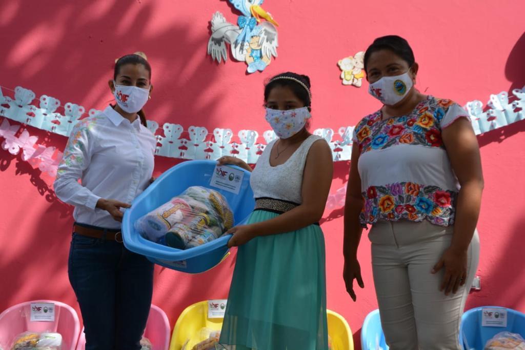 En la localidad de Chekubul, acompañada por la Presidenta de la Junta Municipal de Sabancuy, Angélica Herrera Canúl y del Agente Municipal, Jorge Balán Uc, se realizó la entrega de bañeras y paquetes alimentarios, a futuras mamás.