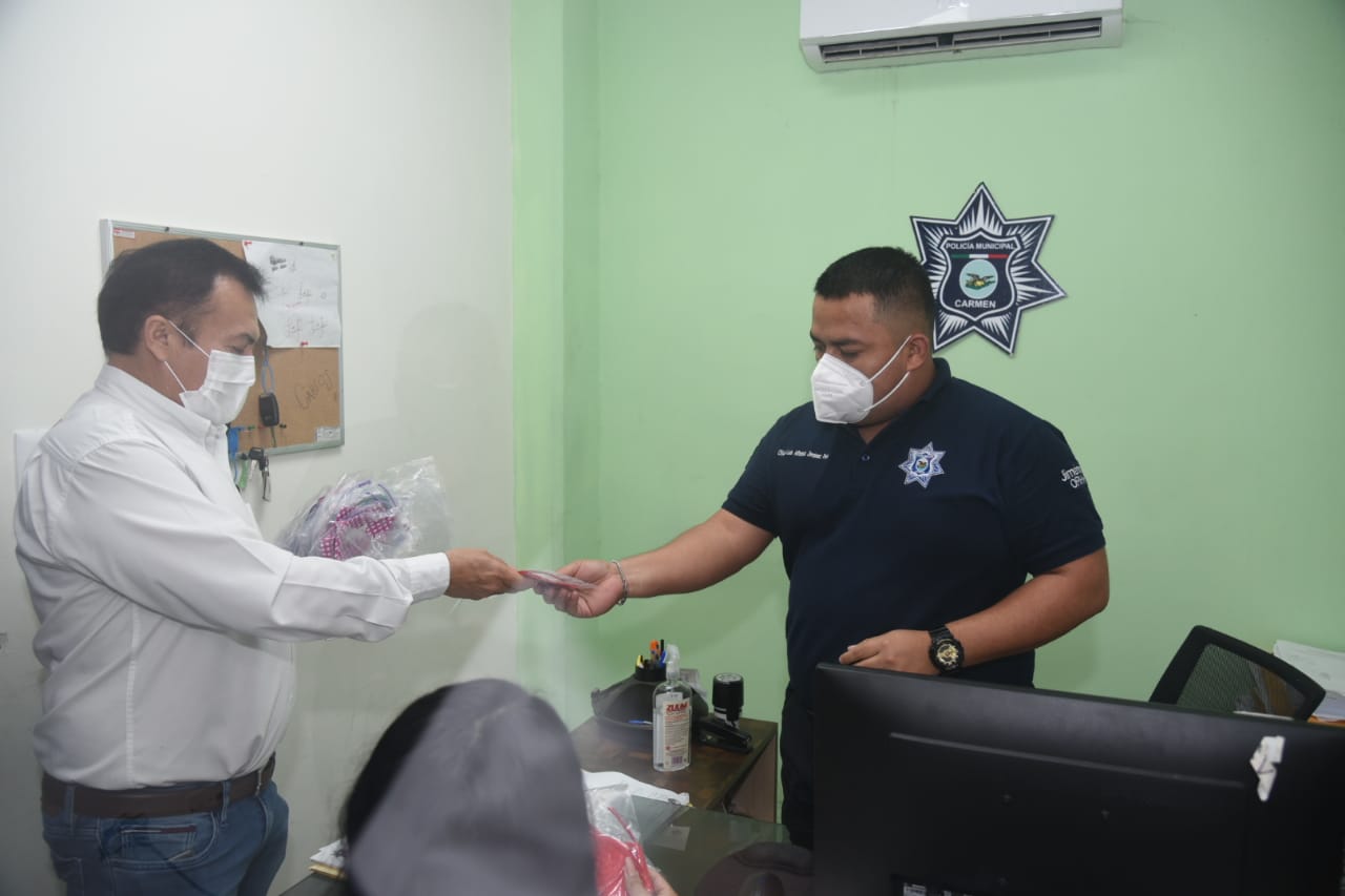 Con el objetivo de seguir cuidando la salud de los carmelitas ante la pandemia del COVID-19, esta mañana el Presidente Municipal de Carmen, Óscar Rosas González en compañía de la Directora del Instituto Municipal de la Mujer de Carmen (IMMC), René Berenice López Fonz, entregó mil cubrebocas de manera gratuita al personal de la Dirección de Seguridad Pública Vialidad y Tránsito Municipal (DSPVyTM).