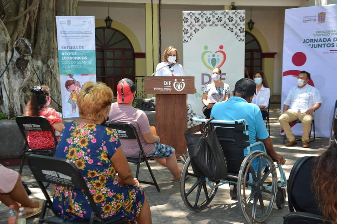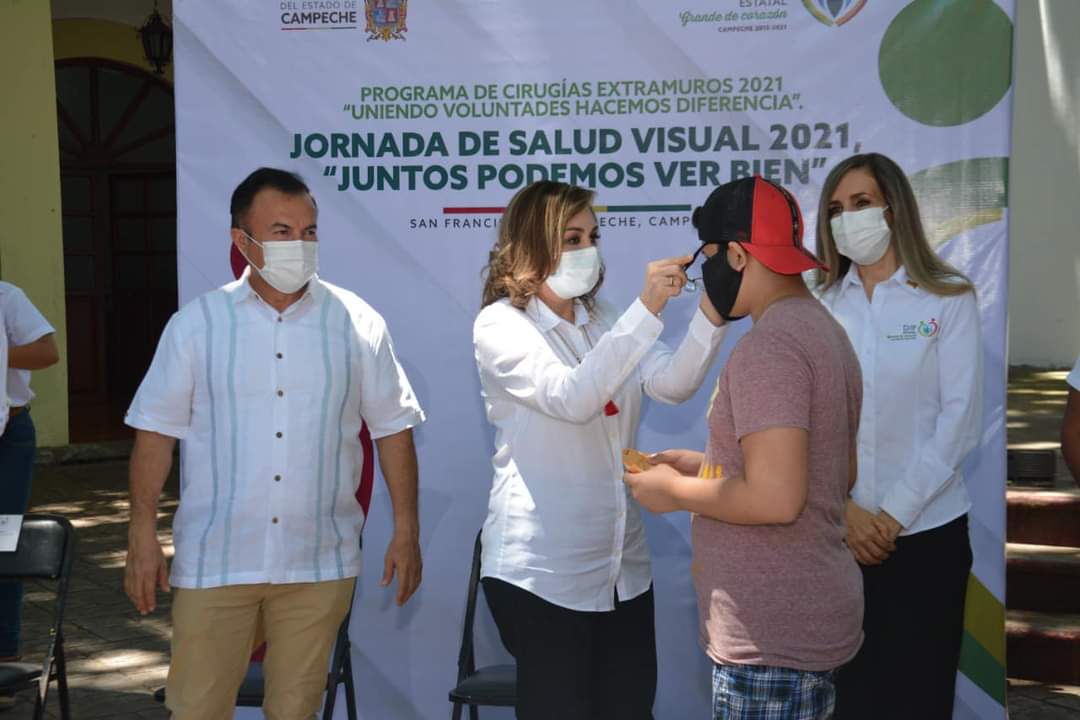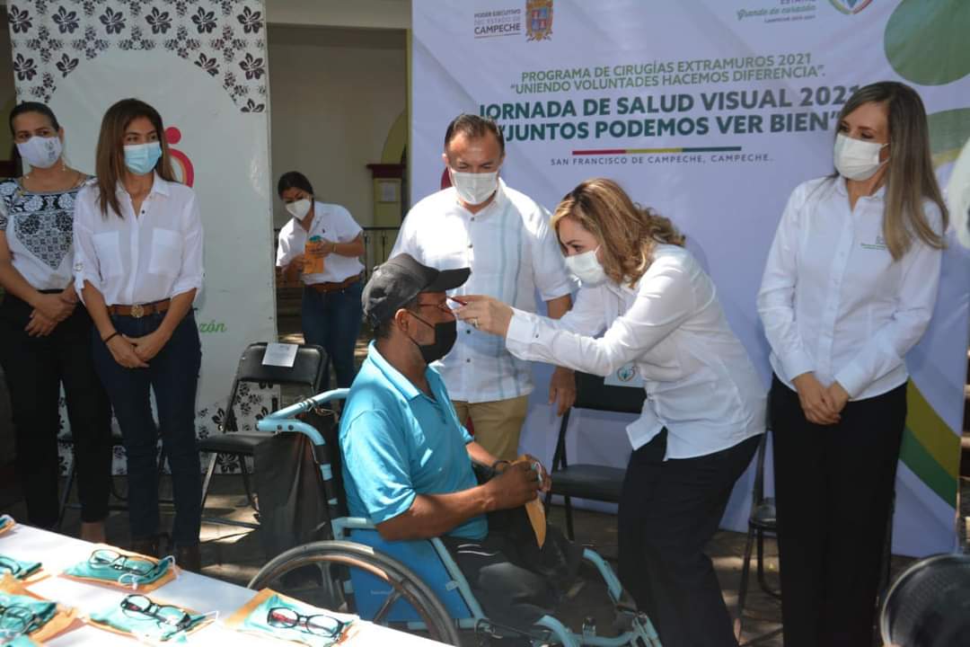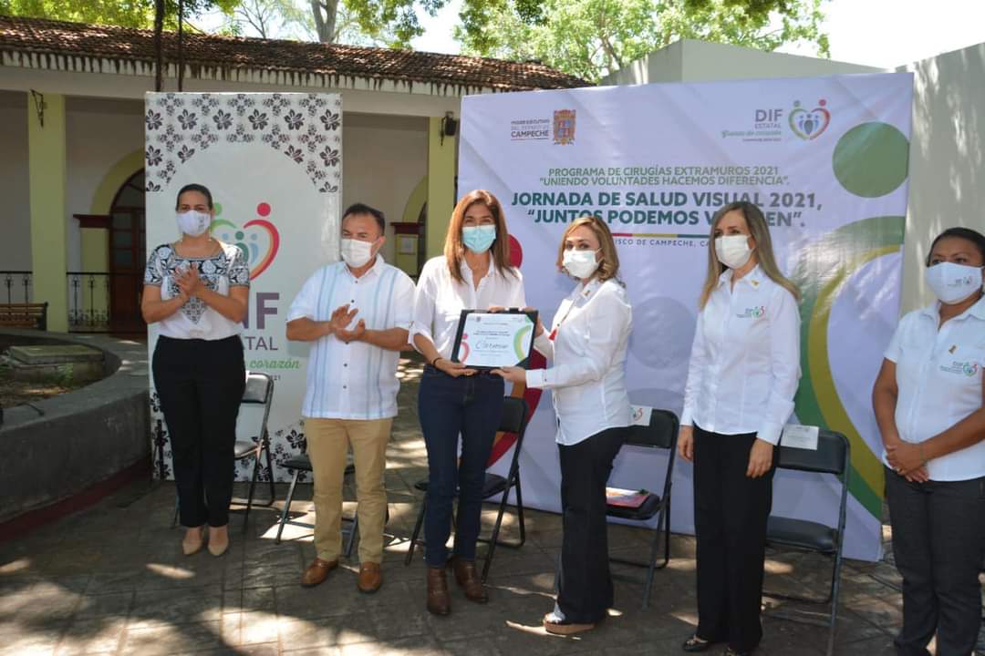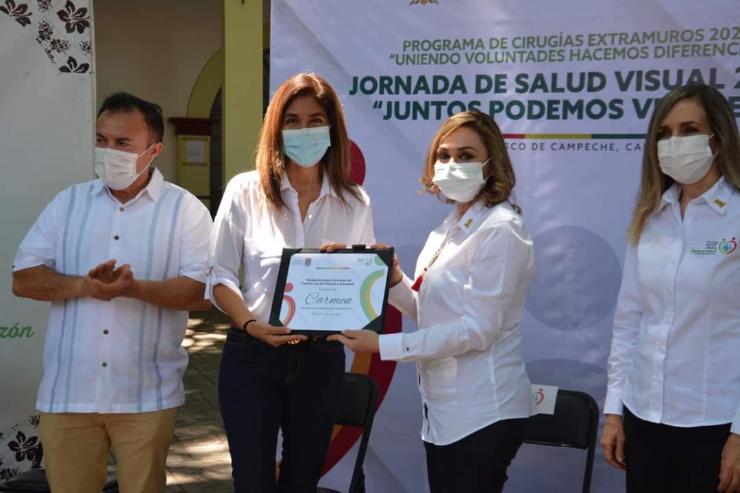 En beneficio de grupos vulnerables de Carmen, el Presidente Municipal de Carmen Óscar Rosas González acompañó a la Presidenta del Patronato del DIF Estatal Campeche licenciada Victoria Damas de Aysa, durante la entrega de lentes de armazón, becas escolares, reconocimientos a los ganadores del Concurso de Vestuario “Diseña, Crea y Recicla 2021” y el libro “Fábrica de Cuentos y Relatos de mis Derechos” al Sistema DIF Municipal Carmen.