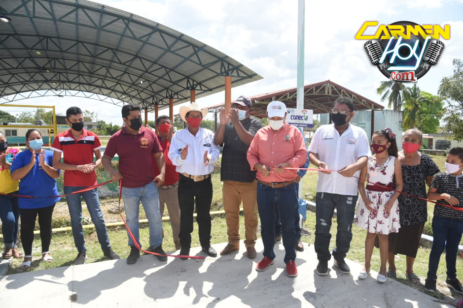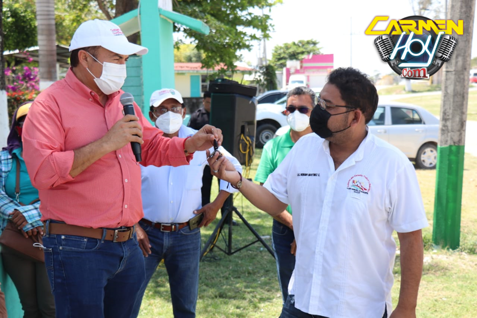 Primeramente el Edil carmelita entregó la construcción de guarniciones, banquetas alumbrado y postes en la calle Carmen Sur en la localidad Aguacatal, arteria vial que también fue pavimentada.