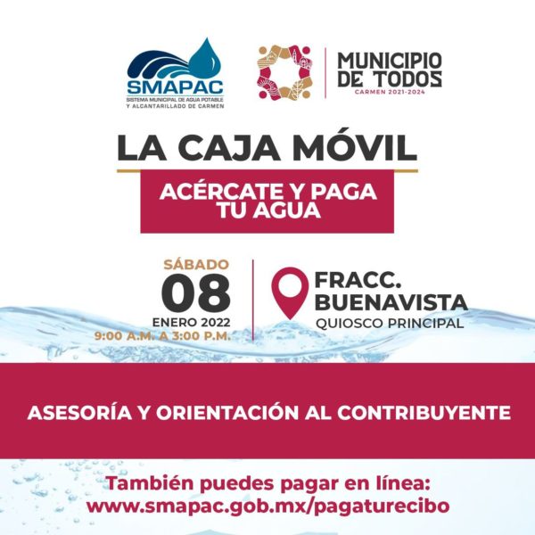 Con el objetivo de que ahorres tiempo y aproveches las facilidades de pago en el servicio de agua potable, el Gobierno Municipal de Carmen pone a disposición de la ciudadanía la Caja Móvil del Sistema Municipal de Agua Potable y Alcantarillado de Carmen (SMAPAC), que este sábado 8 de enero se ubicará en el quiosco principal del Fracc. Buenavista, en horario de 09:00 A.M. a 03:00 P.M.