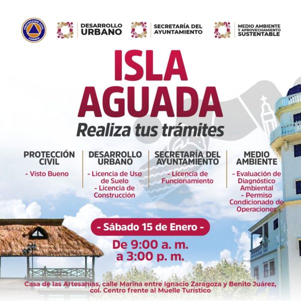 Para acercar los trámites a la población de Isla Aguada, este sábado 15 de enero en horario de 9:00 A.M. a 3:00 P.M, el Gobierno de Carmen llevará el Módulo Móvil de las direcciones de Protección Civil, Desarrollo Urbano Municipal, Medio Ambiente y Aprovechamiento Sustentable, y de la Secretaría del Ayuntamiento.