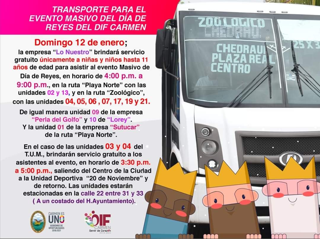 Niños de hasta 11 años de edad, de 4 de la tarde a 9 de la noche, viajan gratis en estas unidades, dentro de la ruta que se señala:
