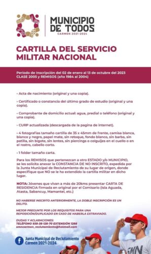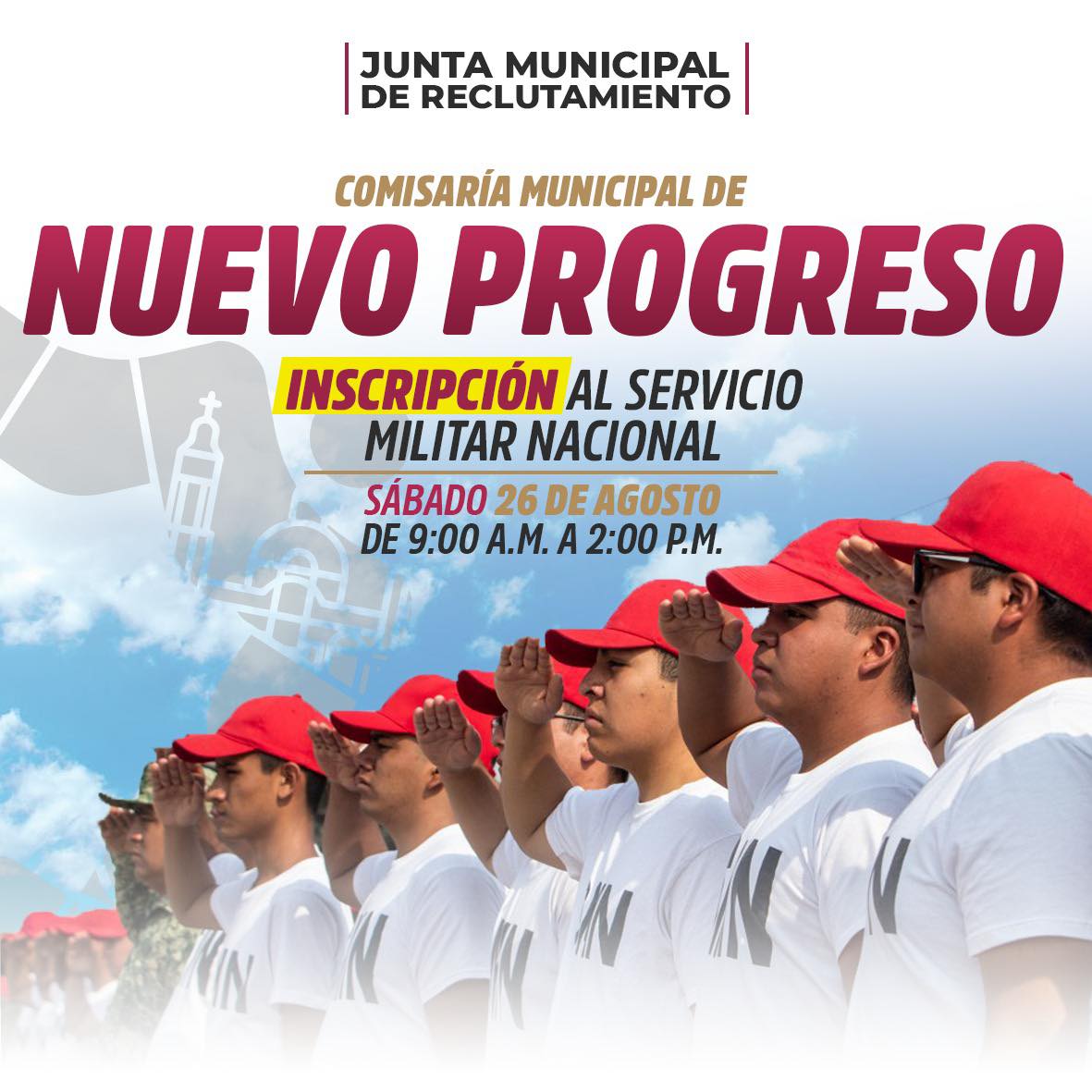 JÓVENES de Nuevo Progreso es su oportunidad de inscribirse al Servicio Militar Nacional MX nos vemos el próximo sábado 26 de agosto en las instalaciones de la Comisaría Municipal en horario de 9 AM a 2 PM