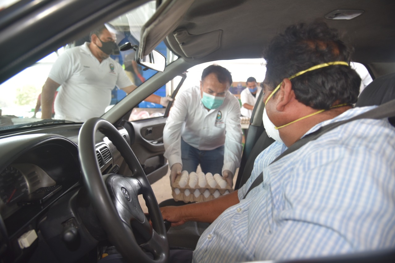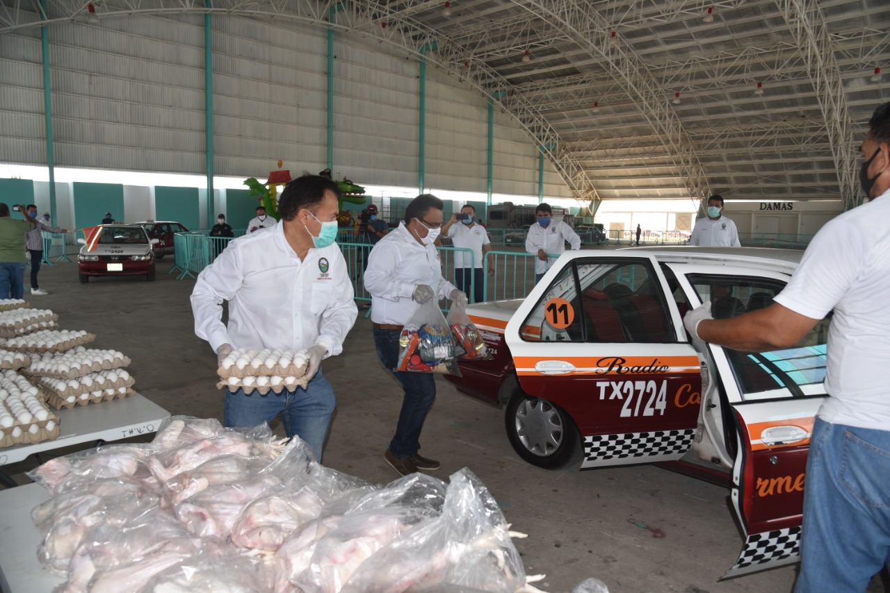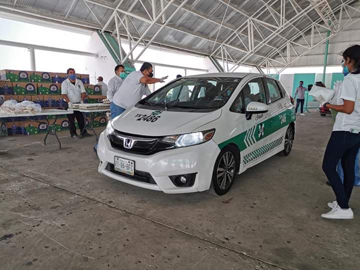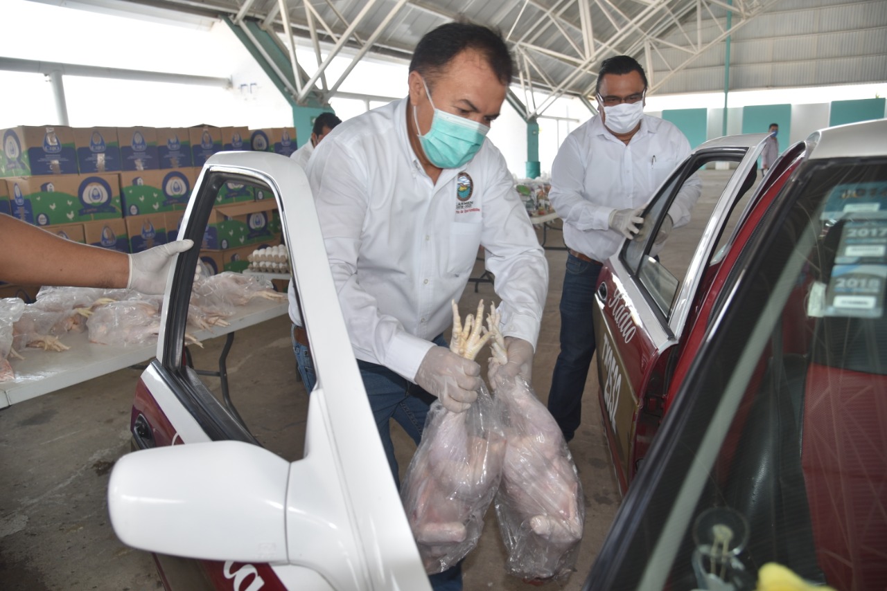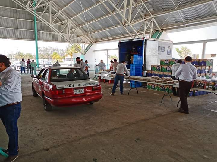 Aplicando las medidas de prevención correspondientes, la entrega de despensas, huevo y pollo a los taxistas se realizó en el interior del Domo del Mar la mañana de hoy donde los beneficiarios en sus unidades recibían este apoyo.