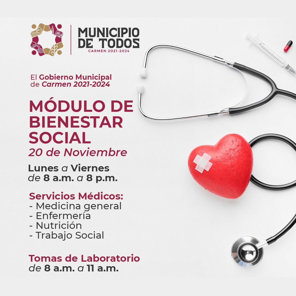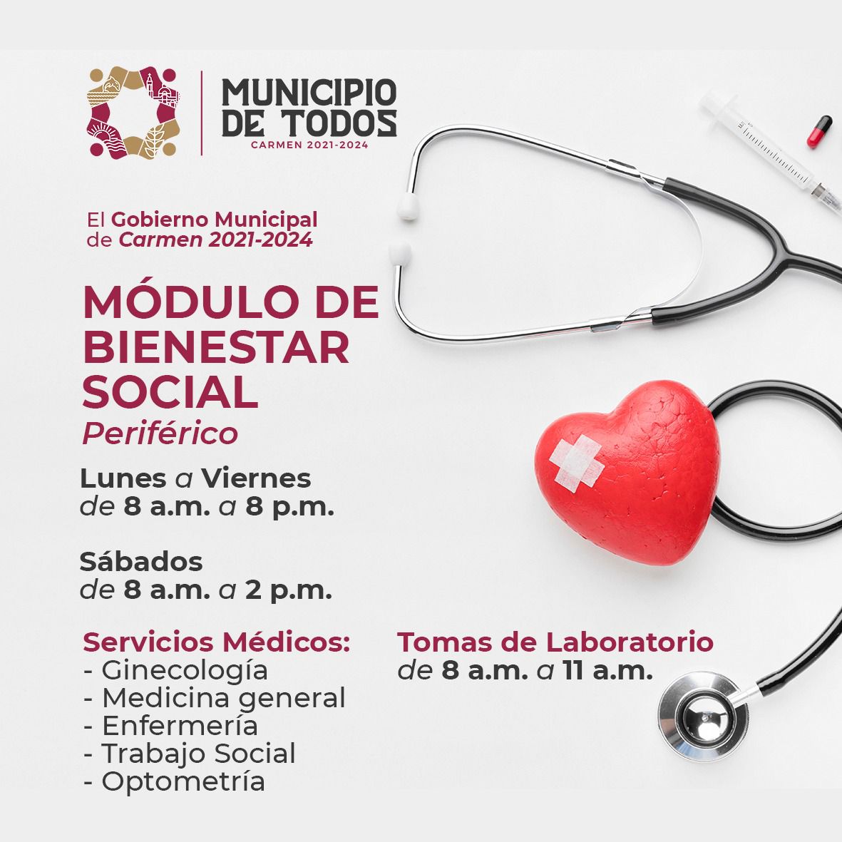 Además contamos con laboratorio de análisis clínicos a bajo costo para apoyar la economía de los carmelitas. Conoce nuestros nuevos horarios, cuida tu salud para estar siempre bien y de buenas.