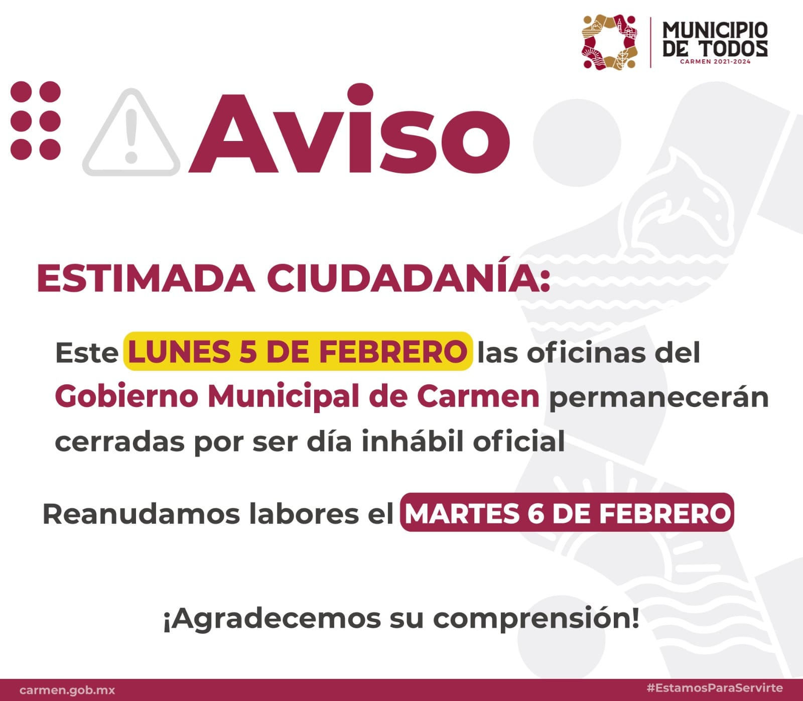 AVISO El lunes 5 de febrero nuestras oficinas permanecerán cerradas al ser un día inhábil