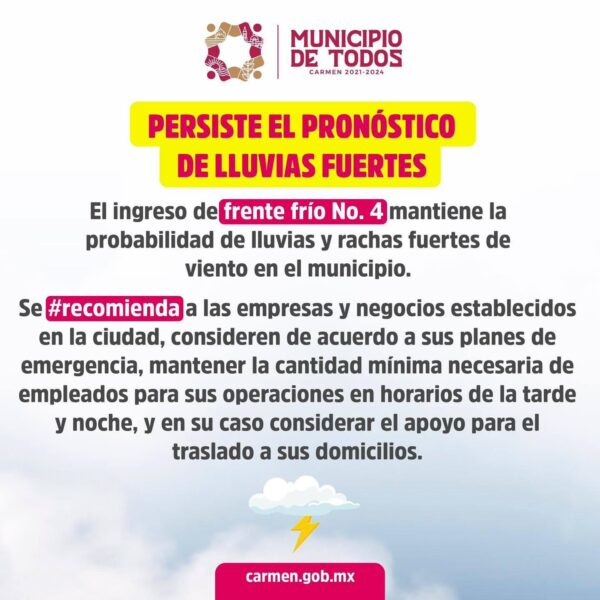 El ingreso de frente frío No. 4 mantiene la probabilidad de lluvias y rachas fuertes de viento en el municipio.