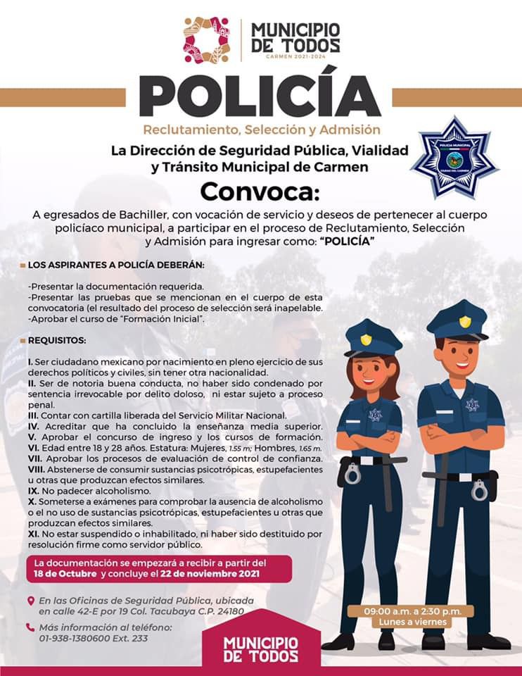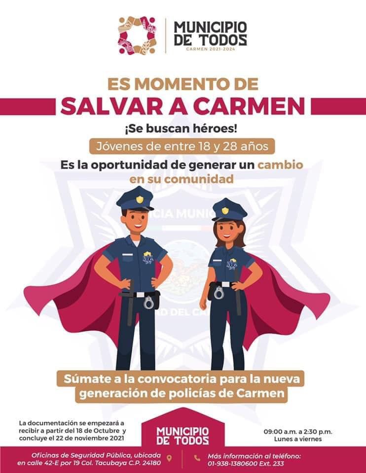 El Gobierno Municipal de Carmen 2021-2024, a través de la Dirección de Seguridad Pública, Vialidad y Tránsito Municipal (DSPVTM), invita a los jóvenes de entre 18 y 28 años de edad a sumarse a la nueva generación de policías municipales, esta es la última semana para participar en el proceso de reclutamiento, selección y admisión.
