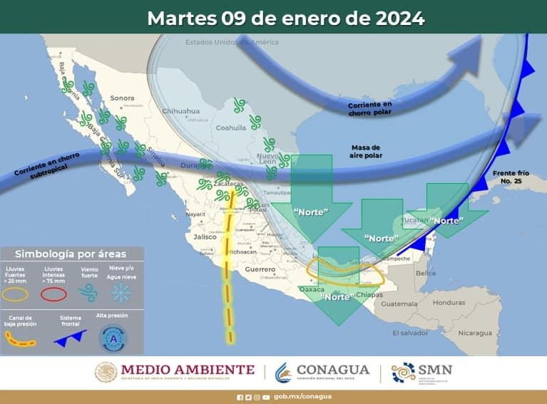 ❄️ Por otra parte, para mañana se pronostica la aproximación del #FrenteFrio No. 25 a la región generando un evento de “norte”.