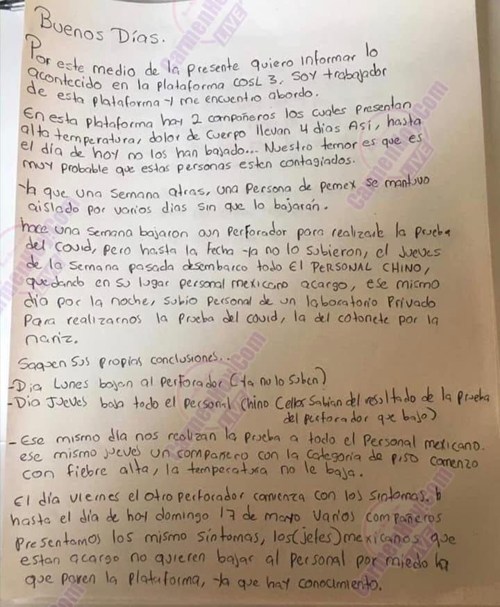 Trabajadores de la plataforma COSL 3 perteneciente a la empresa China Oil Field Service Limited(COSL), nos hicieron llegar por vía inbox, una carta como medida de desesperación ante el posible contagio de varios de sus compañeros, mientras que los petroleros chinos fueron evacuados desde hace varios días dejando solo a mexicanos a cargo de la plataforma.