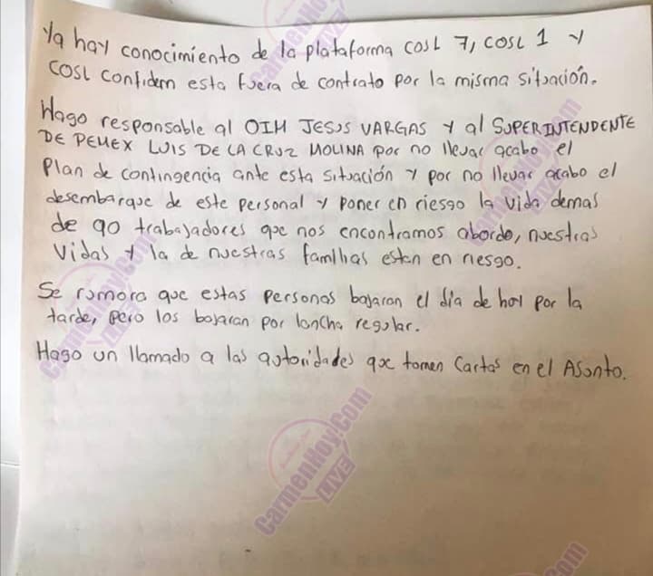 “Hago responsable al OIM Jesús Vargas y al superintendente de Pemex Luis de la Cruz Molina por no llevar a cabo el plan de contingencia ante esta situación y por no llevar a cabo el desembarque de este personal y poner en riesgo la vida de más de 90 trabajadores que nos encontramos abordo, nuestras vidas y la de nuestras familias están en riesgo”. Expresó el trabajador en la carta, escrita en una hoja blanca con su puño y letra.