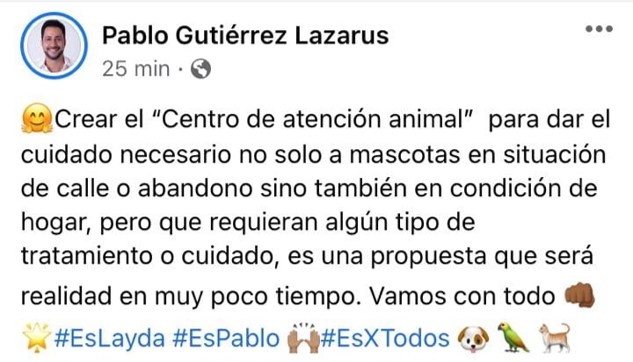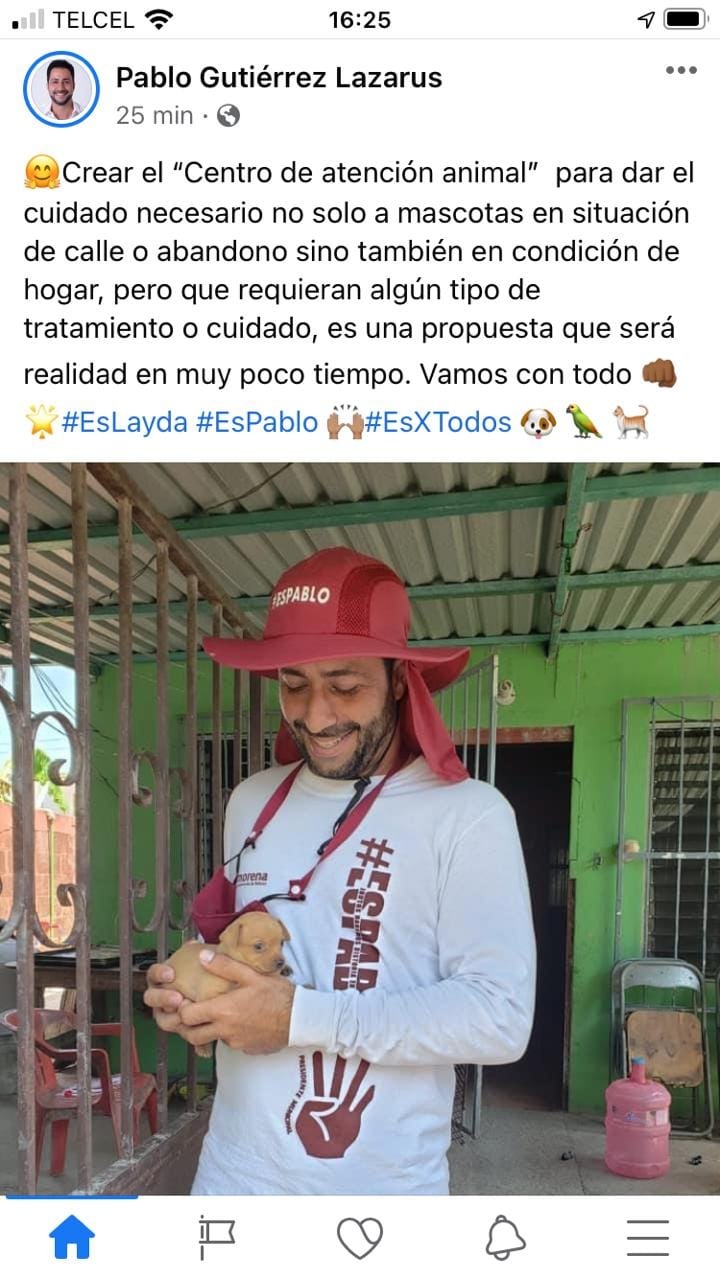 Ahora toma como estandarte buscando la empatía ciudadana a los animales de la calle, cuando durante su administración el amor por ellos pasó desapercibido, nunca le importaron a él solo le importa levantar su campaña como de lugar aún que eso incluya Mentir, y traicionar
