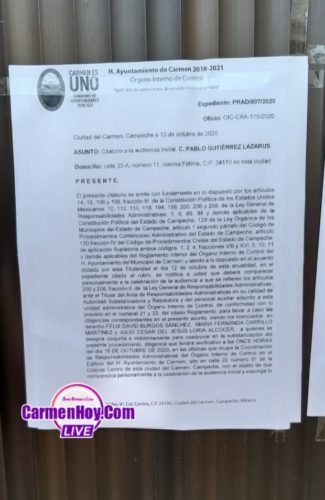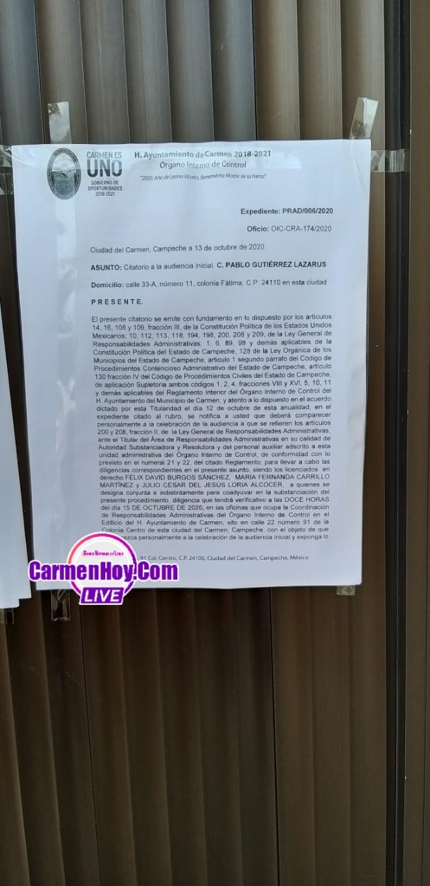 La notificación fue pegada en el portón del exclusivo fraccionamiento donde tiene su residencia, en dicho documento se le informa que se cita para el día jueves 15 de octubre del año 2020, a las 12 horas en las oficinas que ocupa el órgano interno de control en el Palacio Municipal.