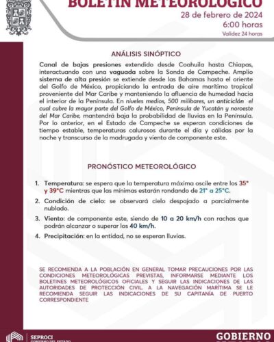 -Esta mañana prevalece evento de “surada” debido a un sistema anticiclónico que domina la región; aunado al ingreso de aire cálido del Mar Caribe favorecerá cielo despejado sin lluvias y temperaturas calurosas durante el dia.