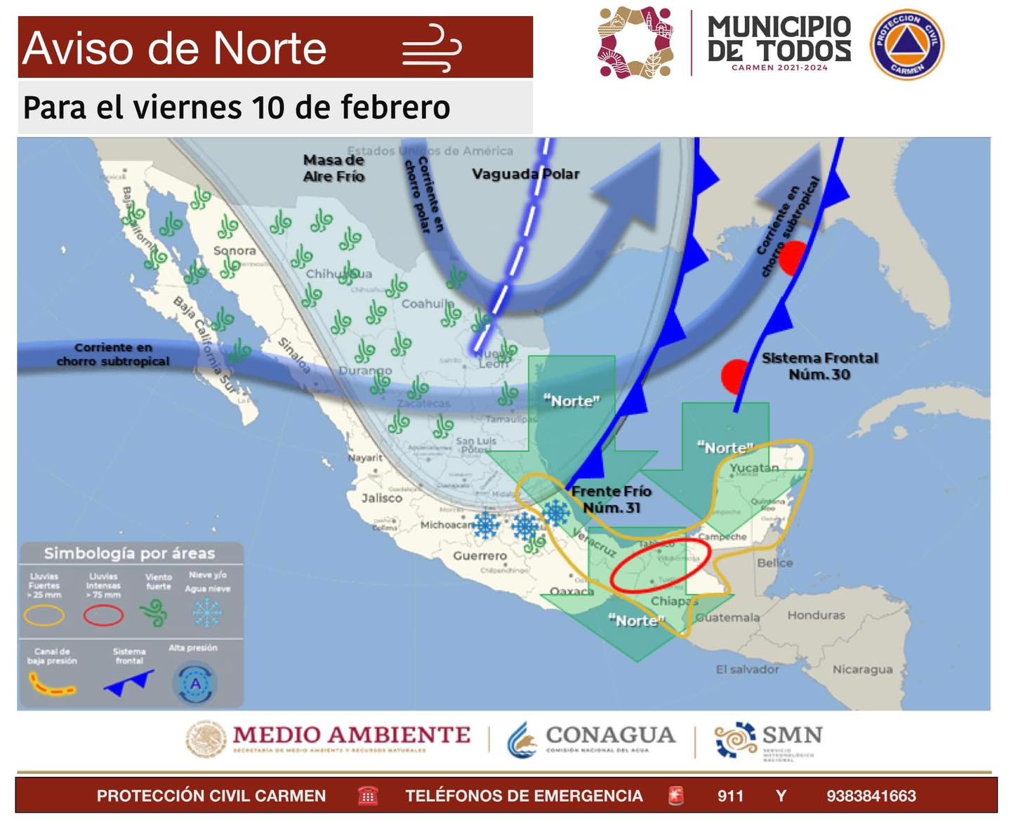 De acuerdo al pronóstico del Servicio Meteorológico Nacional, la aproximación del frente frío No. 31 a la región, generará un “evento de norte” en nuestro municipio a partir del #viernes 10 de febrero.