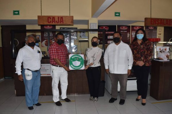 En representación del secretario José Antonio Del Río González, el subsecretario Carlos Alberto Arjona Gutiérrez hizo la entrega del distintivo, acompañado del director de Desarrollo Social y Económico municipal, Alberto Can Sánchez, Carlos García de COPRISCAM Carmen y Jessica León Damián, del INDEMIPYME.