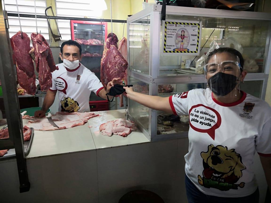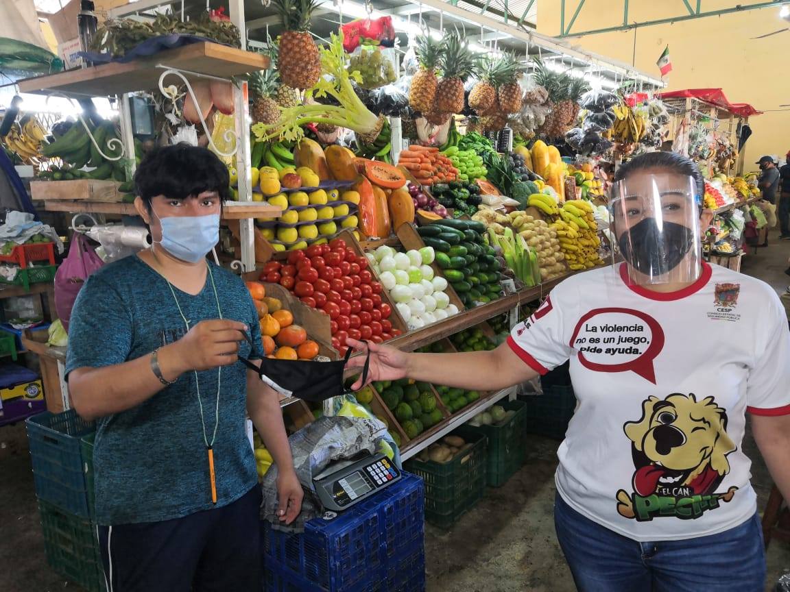 En atención a lo instruido por el Gobernador Carlos Miguel Aysa González, referente a la contingencia sanitaria del virus SARs Cov2, personal del Consejo Estatal de Seguridad Pública (CESP) intensificó la campaña contra el COVID-19, distribuyendo 300 productos de protección y material de difusión entre transeúntes, comerciantes y propietarios locales de la colonia Morelos (Holoch) y mercado de San Francisco.