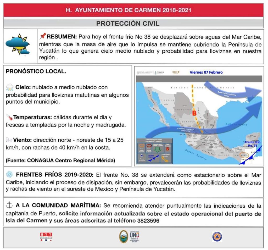 Para el día de hoy se espera ambiente de algo caluroso a caluroso durante el día con cielo de mayormente despejado a medio nublado, soplaran vientos del norte y noreste, esperándose que la máxima temperatura oscile de entre los 25,0 °C a 31,0 °C en las primeras horas de la tarde y la temperatura mínima oscile de entre los 13,0 °C a 24,0 °C en el amanecer del día de mañana sábado.