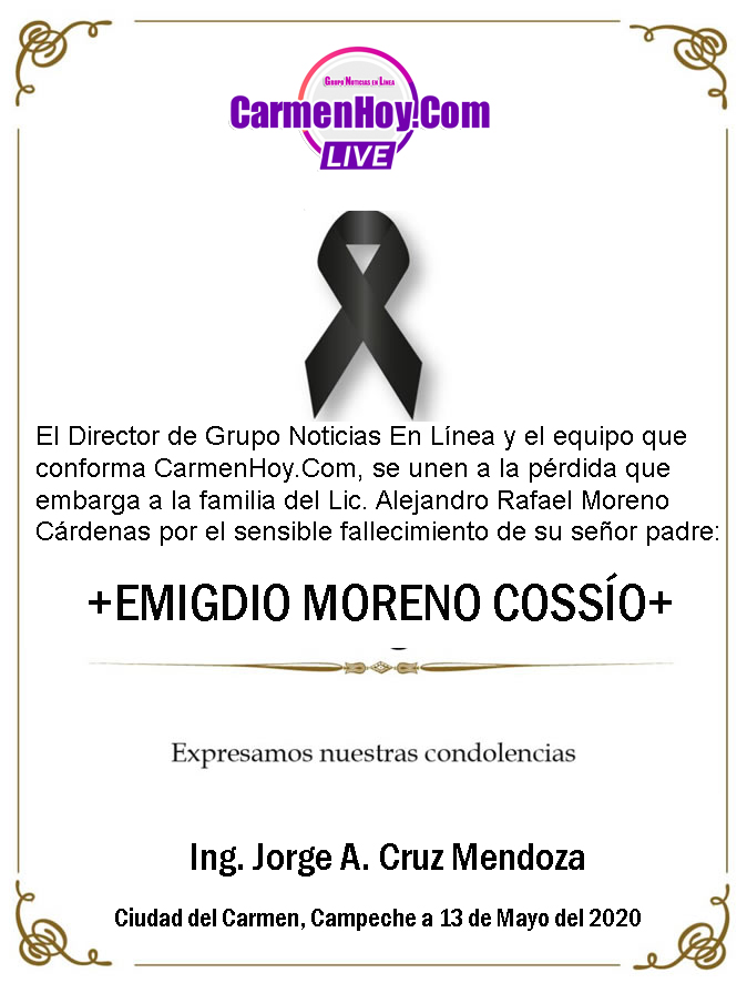 El Director de Grupo Noticias En Línea y el equipo que conforma CarmenHoy.Com, se unen a la pérdida que embarga a la familia del Lic. Alejandro Rafael Moreno Cárdenas por el sensible fallecimiento de su señor padre:
